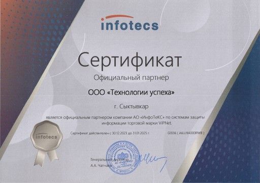 Компания «Технологии успеха» - официальный партнер АО «ИнфоТеКС». Имеет действующую лицензию ФСТЭК на деятельность по технической защите конфиденциальной информации, и лицензию ФСБ на распространение шифровальных (криптографических) средств, работы в области шифрования информации. В нашей компании работают сертифицированные специалисты, которые подберут оптимальное решение для вашей компании, окажут помощь по установке и настройке. Получите консультацию и узнайте о возможности проведения пилотного проекта по телефону